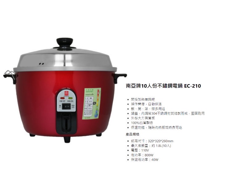 賜豐家電 南亞牌 10人份不鏽鋼電鍋 quantity